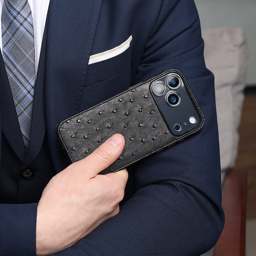 Чехол-накладка кожаная для iPhone 17 Pro Max, страус черного цвета