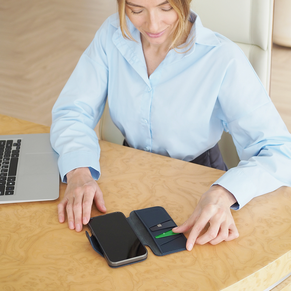 André — чехол-книжка с 3 встроенными отделениями для карт. Синяя телячья кожа — тонкий, прочный слой с естественной зернистой текстурой, приятной на ощупь.