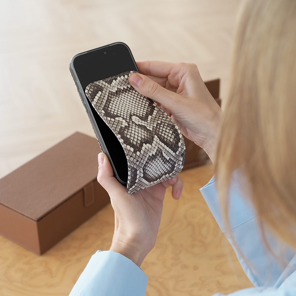 Ультратонкий, легкий, надежный и качественный чехол Robert. С магнитами внутри. Поддержка MagSafe. Натуральная кожа питона, натурального цвета.