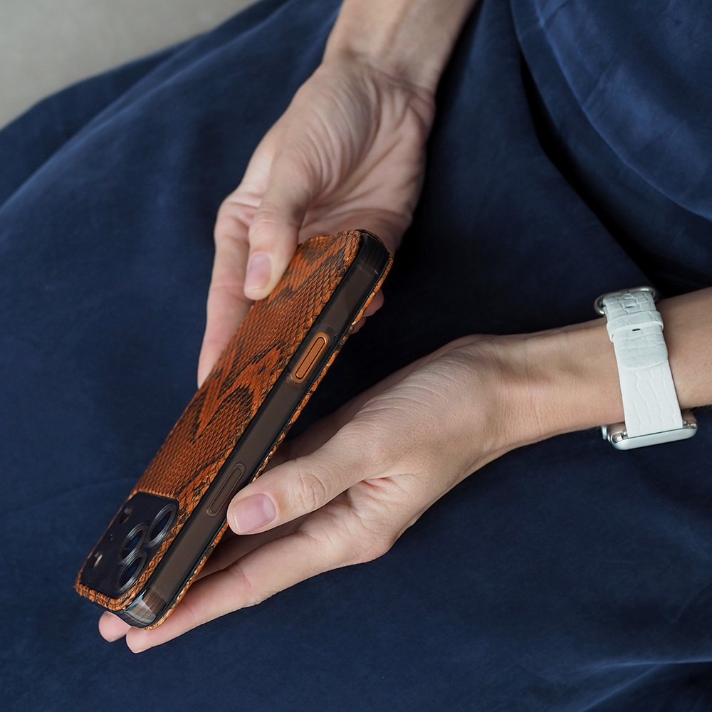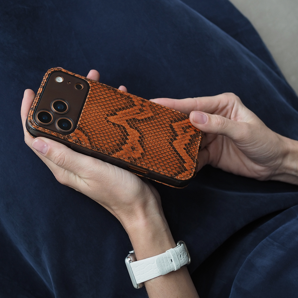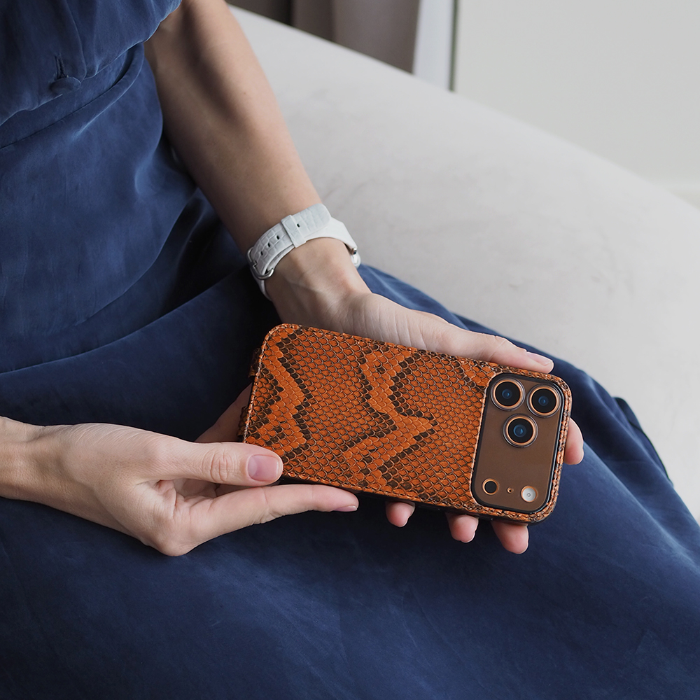 Чехол для iPhone 17 Pro Max из кожи питона цвета коньяк — это выразительный аксессуар с тёплым, глубоким оттенком, который подчёркивает статус и стиль. Кожа питона отличается мягкой, эластичной выделкой и при этом высокой устойчивостью к износу, благодаря чему 17 pro max чехол сохраняет премиальный внешний вид со временем. Каждый чехол уникален за счёт природного рисунка чешуи.