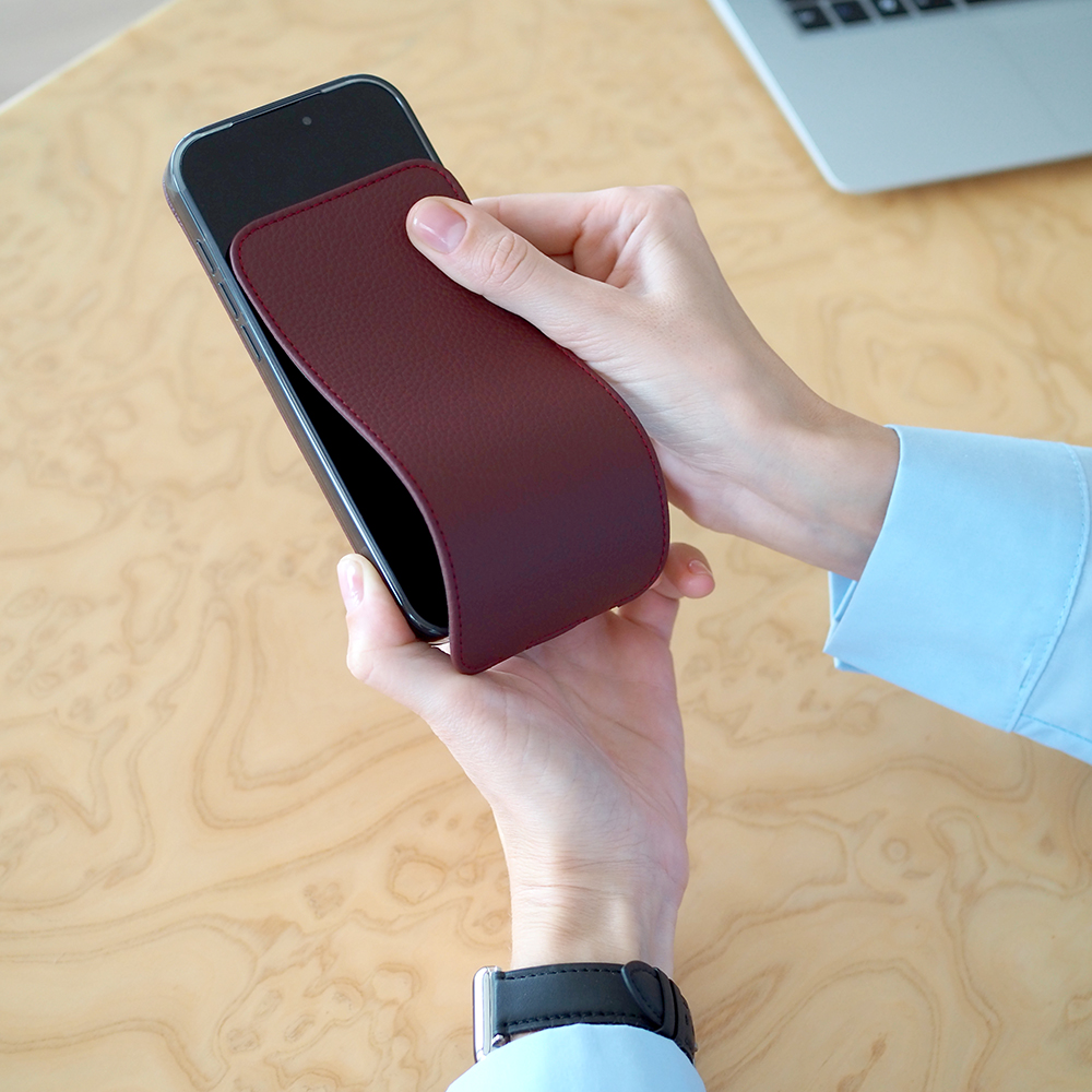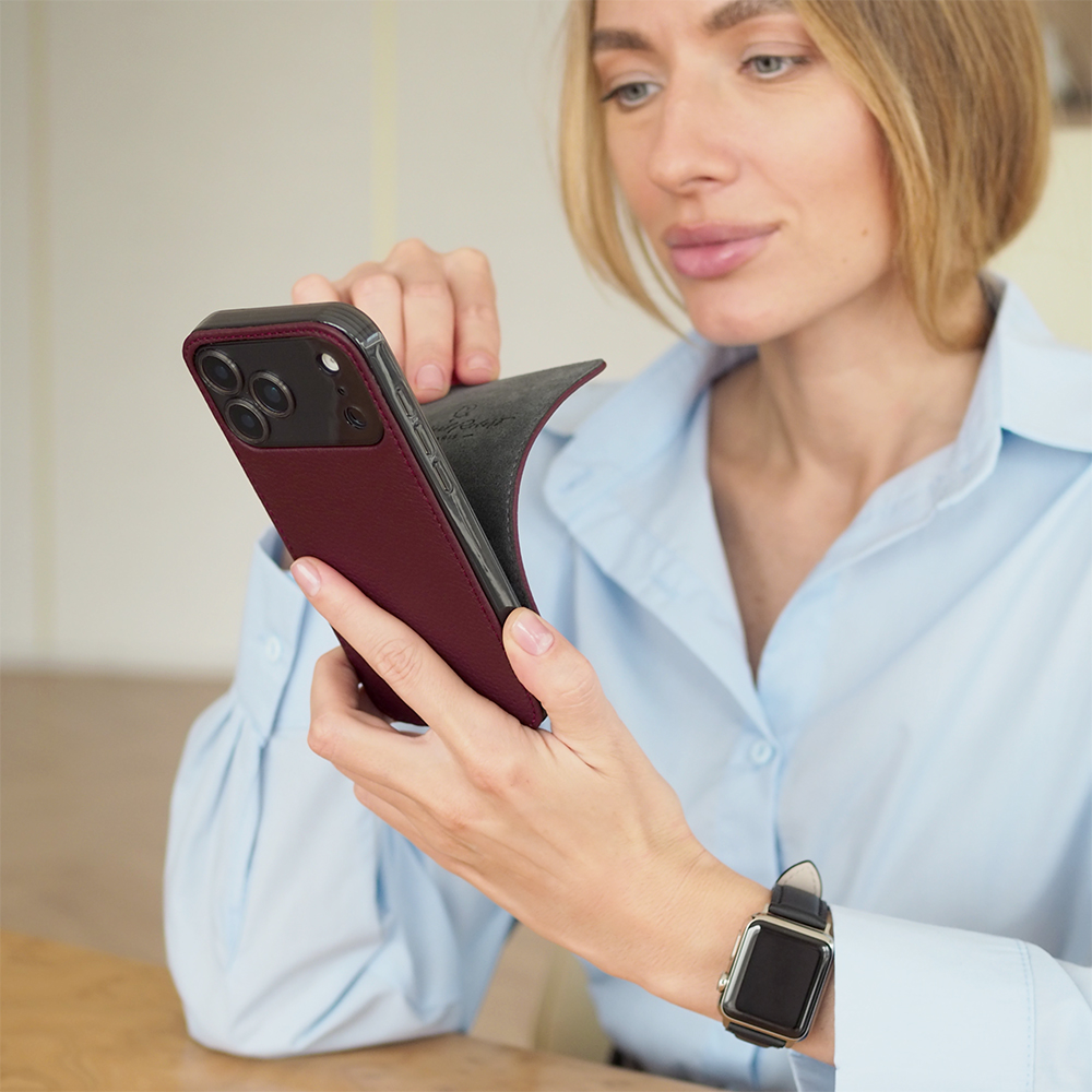 Ультратонкий, легкий, надежный и качественный чехол Robert. С магнитами внутри. Поддержка MagSafe. Натуральная кожа теленка, бордового цвета.