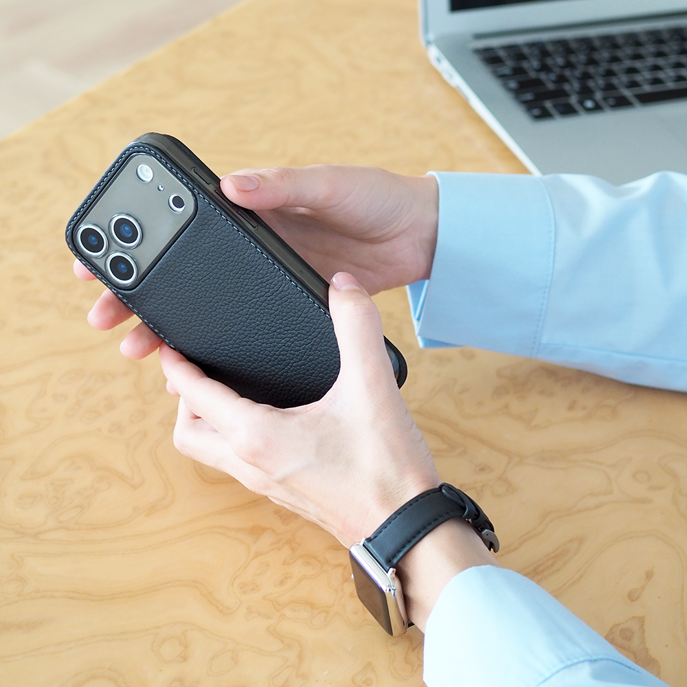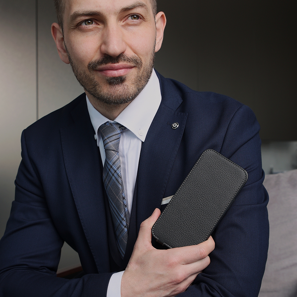 Ультратонкий, легкий, надежный и качественный чехол Robert. С магнитами внутри. Поддержка MagSafe. Натуральная кожа теленка, черного цвета.