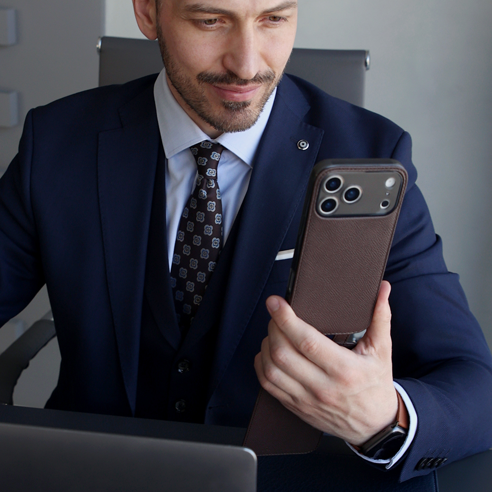 Ультратонкий, легкий, надежный и качественный чехол Robert. С магнитами внутри. Поддержка MagSafe. Натуральная кожа сафьяно, коричневого цвета.