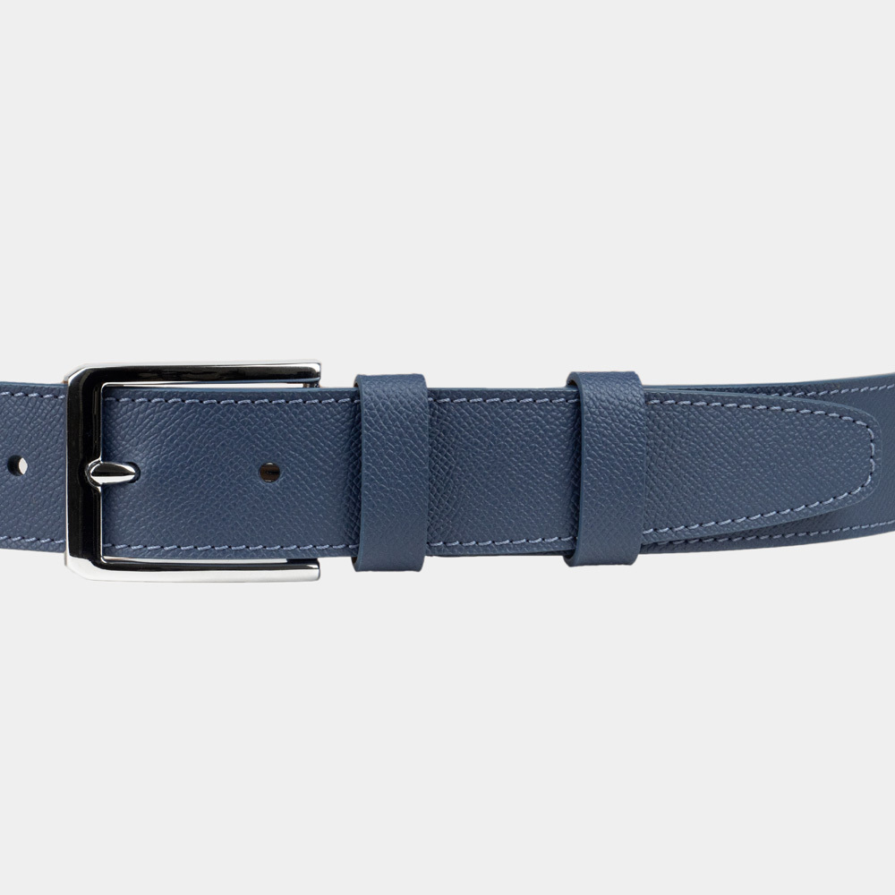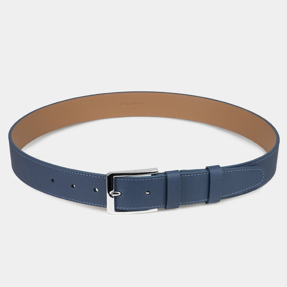 Ремень мужской из кожи теленка Saffiano синего цвета со стальной пряжкой